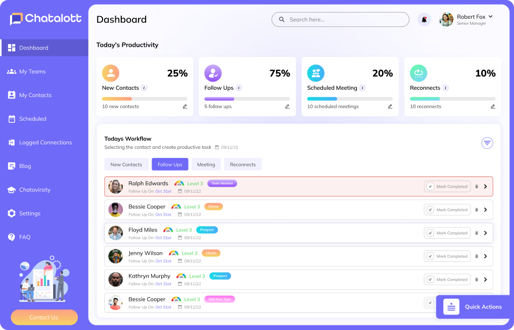 Start each day with clarity and connection. Chatalott’s dashboard highlights your follow-ups, meetings, and reconnect suggestions—so you always know who to reach out to, what’s next, and how close you are to your daily goals.